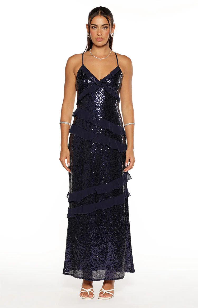 Make a sparkling impression in our Inara Navy Sequin Ruffle Maxi Dress, designed for formal events and parties! This maxi features a stunning base with delicate chiffon ruffle detail and an adjustable lace-up back for a refined fit. Style it with strappy heels and minimal to keep the focus on the eye-catching fabric and elegant silhouette.